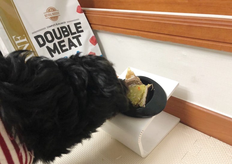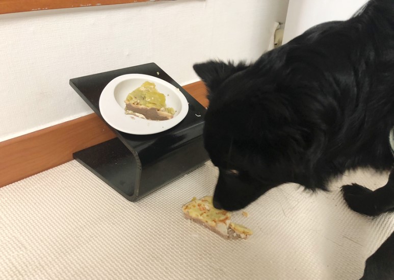 너무 많이 주기는 그렇고 루이와 구름이가 한 조각씩 먹을 수 있게 보기좋게 잘라서 강아지 그릇에 담았어요. 벌써부터 얼른 먹고 싶어하는 루이와 구름이!