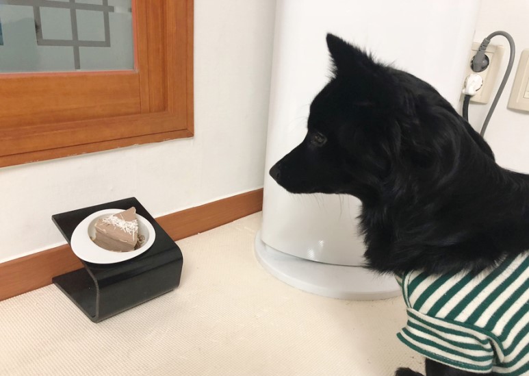 강아지 간식도 이것저것 먹지만 루이와 구름이는 케이크가 처음이예요. 처음 케이크를 보자마자 되게 궁금한 것 같았어요.