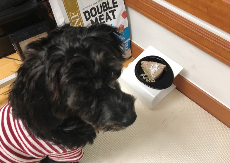 수제케이크라서 그런지 강아지들에게 좋은 재료로만 만든 수제케이크, 케이크 가져오고 나니까 강아지들이 냄새를 맡고 구름이와 루이가 케이크 옆에서 서성거리고 있었어요.