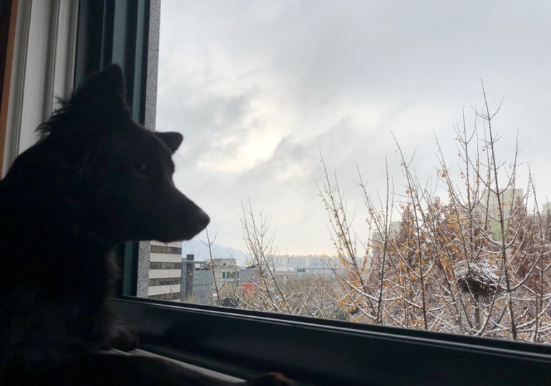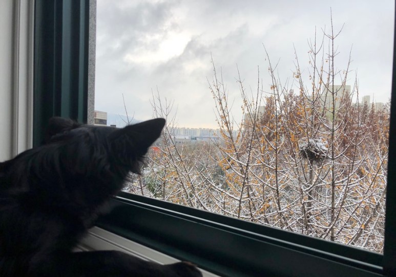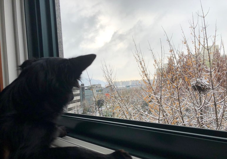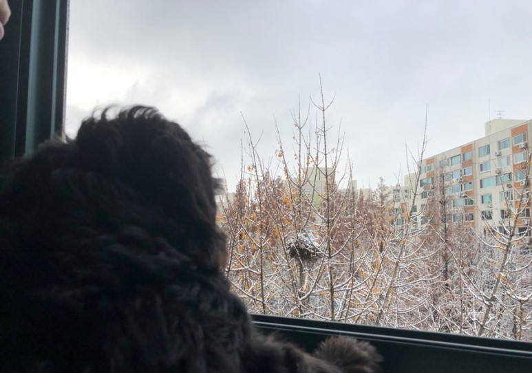 강아지와 함께 집에 있는데 눈이 왔어요. 오늘은 아침에 조금 일찍 일어났는데, 약간 쌀쌀한 느낌이 들어서 베란다에 나가보니까 눈이 엄청 오더라구요. 그래서 집에서 강아지와 함께 눈 구경했어요.