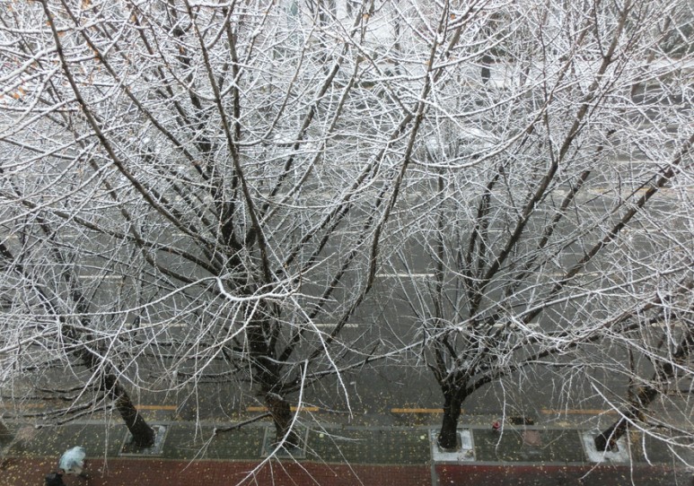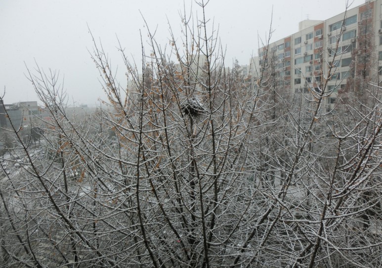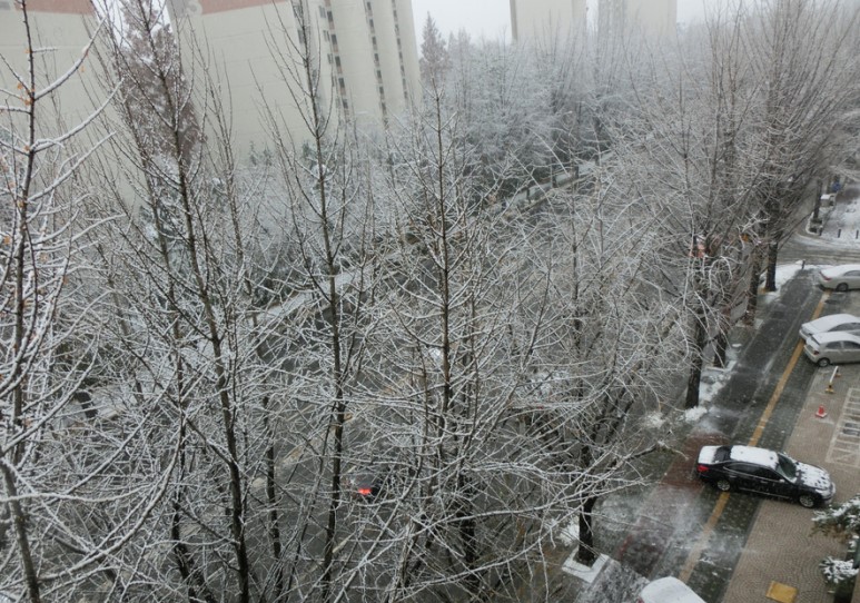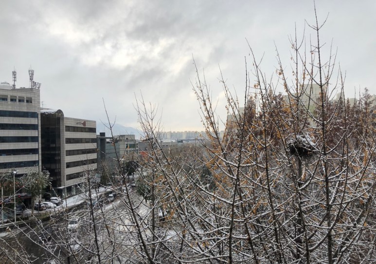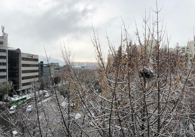 창문을 열면 여기 앞 도로가 훤히 보이는데 눈이 많이 내려서 그런지 도로 위의 자동차들이 거북이처럼 천천히 가더라구요. 그리고 아침부터 눈이 많이 쌓였으니까 거리를 청소하시는 분들도 많이 있었어요. 아마 다른 지역에서도 눈이 많이 내렸을 것 같아요.