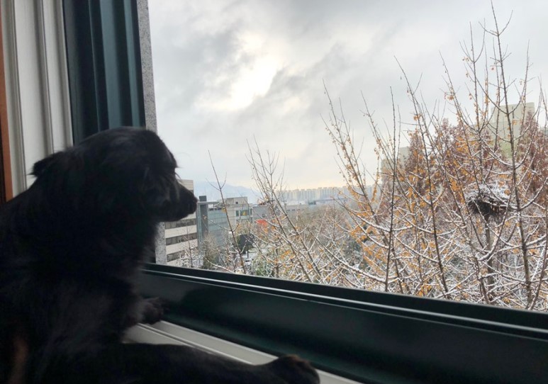 강아지들에게도 하늘에서 내리는 눈이 신기할 거 같았어요. 태어나서 처음 구경하는 눈! 쌀쌀한 바람이 창문 문을 열었더니 시원하게 불어옵니다. 아침부터 일을 하러 가는 사람들도 있을텐데 추워서 걱정을 했어요.